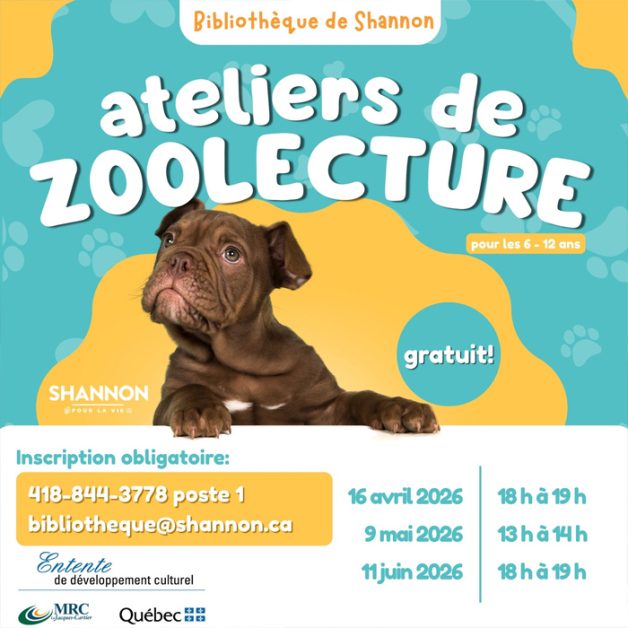 Lire… avec un chien comme auditeur! La bibliothèque de Shannon accueille Isabelle Mongrain (Complice et malice) et son adorable beagle Puppy pour des ateliers de zoolecture destinés aux enfants de 6 à 12 ans. Les jeunes pourront lire à voix haute à Puppy dans un environnement calme et bienveillant. Une façon amusante de développer la confiance en soi, le plaisir de lire et les habiletés sociales! Inscription obligatoire. Détails : shannon.ca/evenement/ateliers-de-zoolecture-a-la-bibliotheque.