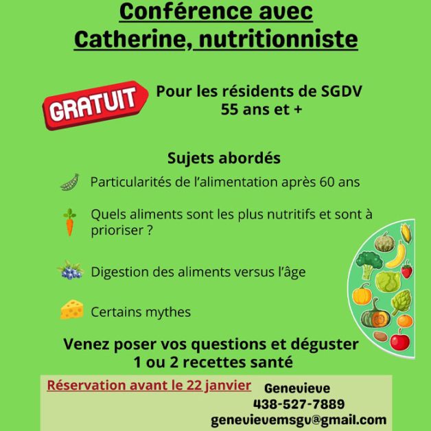 Encore une belle opportunité pour les 55 ans et plus! Une nutritionniste viendra nous guider et nous démêler sur la nutrition pour les 60 ans et plus. Période de questions et même 1 ou 2 recettes à déguster! Gratuit pour les citoyens de SGDV (5$ pour tous les autres). Inscription obligatoire auprès Geneviève avant le 22 janvier (places limitées). Informations au www.facebook.com/saintgabrieldevalcartier.