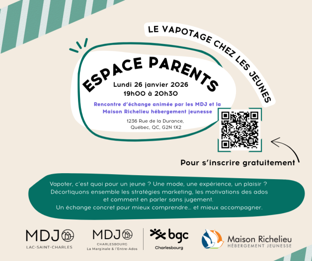 Parents, participez gratuitement à l’atelier organisé par les MDJ du Lac-Saint-Charles et La Marginale avec une intervenante de la Maison Richelieu ! Comprenez ce que vivent les ados face au vapotage, démystifiez les risques et repartez avec des outils concrets pour mieux les accompagner. Ne manquez pas cette occasion d’échanger et de soutenir votre ado. Infos et inscription sur nos réseaux et sites web.
